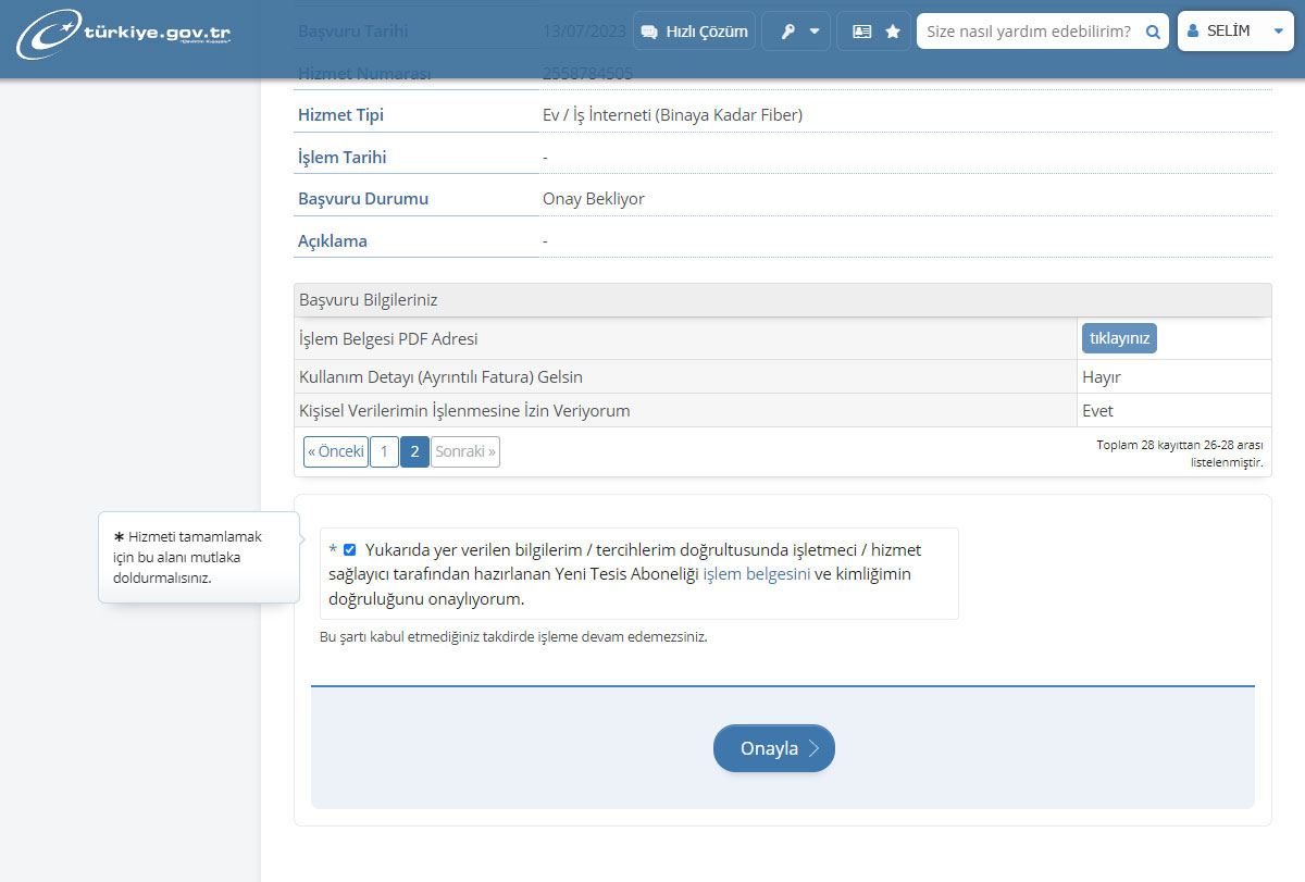 Yönlendirileceğiniz sayfada, yapmış olduğunuz başvurularınızın listelendiği bir ekran görüntülenecektir. Başvurunuzu kontrol edin ve ilgili başvurunun yanında bulunan "Onayla" butonuna tıklayın. Bu adım, başvurunuzun onaylanmadan önce başvuru detayı sayfasına yönlendirecektir. Başvuru detayı sayfasında gerekli bilgileri kontrol edin ve son onayınızı vermek için ilgili butona tıklayın.